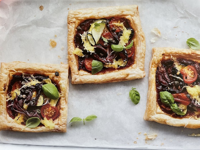 Arrange the ingredients on top of the pastry squares up to the border.